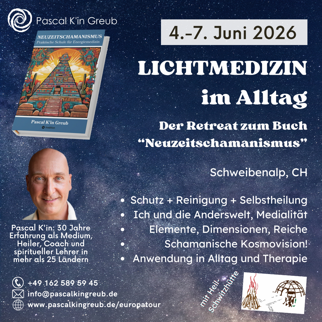 „Es ist nicht die Technik sondern die Tiefe, das Herz, welche den inneren, echten Schamanen gebärt. Auch du kannst ein Neuzeitschamane sein, ein Wissender, der die Spiritualität erdet, der das Wissen lebt, jeden Tag! In diesen Zeiten ist es so wichtig, dass wir das Alte Wissen um Heilung und Schöpfung in den Alltag bringen, ins Büro, in die Familie, in die Küche, in die Partnerschaft!“ Pascal K’in aus Mexiko sucht in dieser praktischen Schule für Energiemedizin mehr als nur Techniken und heiliges Wissen zu vermitteln, sondern die gelebte Philosophie und das Bewusstsein dahinter, die dein altes Leben in ein neues aus Licht, Leichtigkeit und Magie im ALL-tag verändern werden.