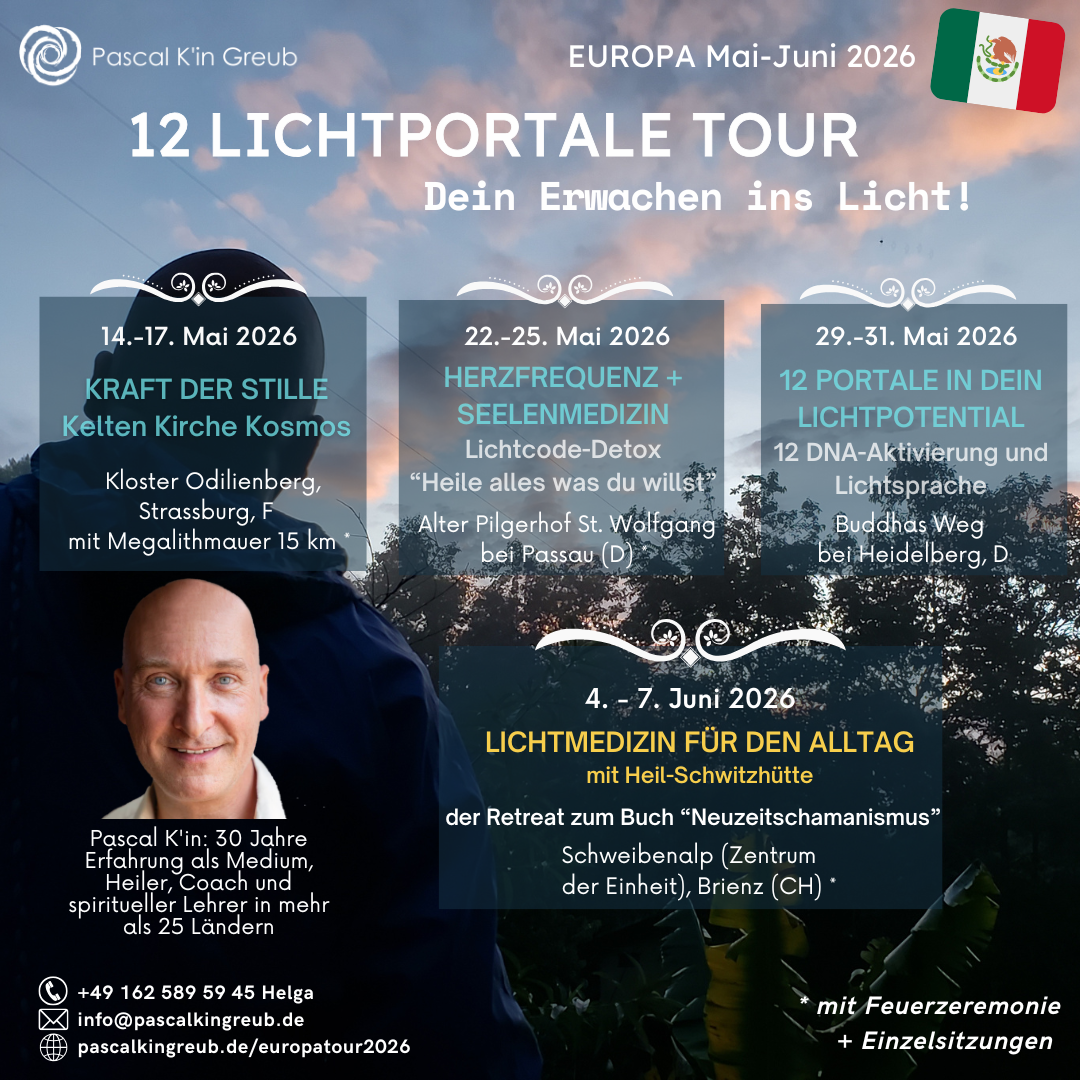 Kröne dein 2026 mit der wohl am weitreichendsten Lichtarbeit die es gibt: Vieles davon hat Pascal K’in in vielen Jahren als Heiliges praktisches Wissen der Maya direkt übermittelt bekommen. Jetzt ist die Zeit da, dass wir diesen Weg der Neuen Zeit gehen! Und jeder kann es, es ist super einfach für Einsteiger und eröffnet neue mediale Lichtwelten für spirituell Erfahrene. Du wirst sehen, dass du wirklich ALLES schon in dir hast, die Lichtkörper sind nur einfach noch abgeknipst wie alte Glühbirnen…