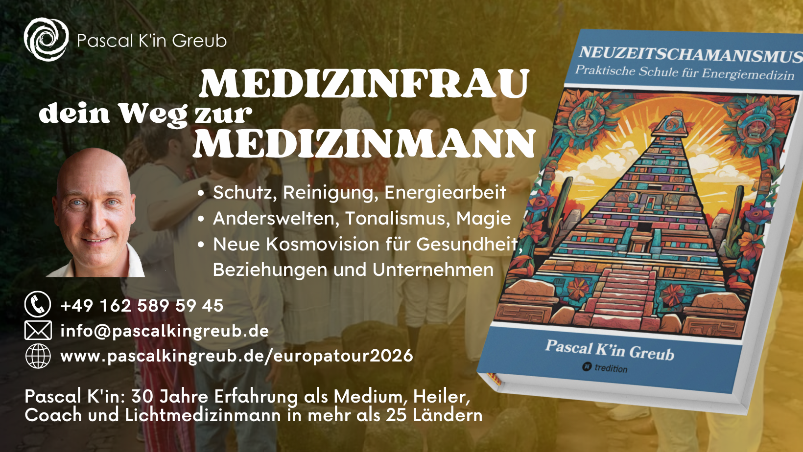 Dies ist auch der Workshop zum neuen Arbeitsbuch NEUZEITSCHAMANISMUS in Ethnomedizin, Energie- und Lichtmedizin, mit dem dir Pascal K’in 25 Jahre Erfahrungen bei den Maya, direkt übermittelt von Mayapriester Don Lauro, sowie als Heiler und Workshopleiter aus Mexiko mitbringt! Schamanismus war einst Urreligion – hier erfährst du, wie du sie jeden Tag leben kannst, was deine Wahrnehmung der Menschen, der Welt vollkommen verändern wird.
