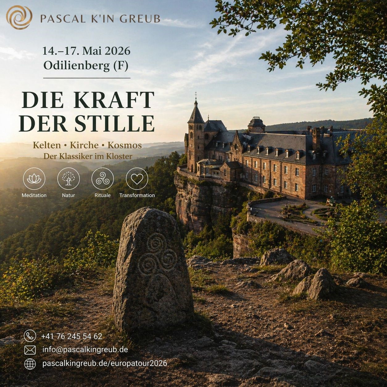 Komm zum Stilleretreat für Meditation, Liebe, Studium und alte Rituale; im Kloster, im Druidenwald, Feenplateau und am Sonne- und Mondstein. Mit persönlicher Betreuung durch Pascal K’in. Du wirst eintreten in die Stille deines liebenden Herzens, tankst Energie an magischen Kraftplätzen, heilst dich beim Heilpilgern und Waldbaden und erinnerst in einer kollektiven Heilung der Schwelle der Alten und Neuen Zeit in Europa, unter der Führung der Avatarin „Heilige Odilie“, ehemalige frühchristliche Heilerin, eingeweihte Bärenfrau, Seelsorgerin für Bedürftige und Blinde, sowie Heilige der Katholischen Kirche.